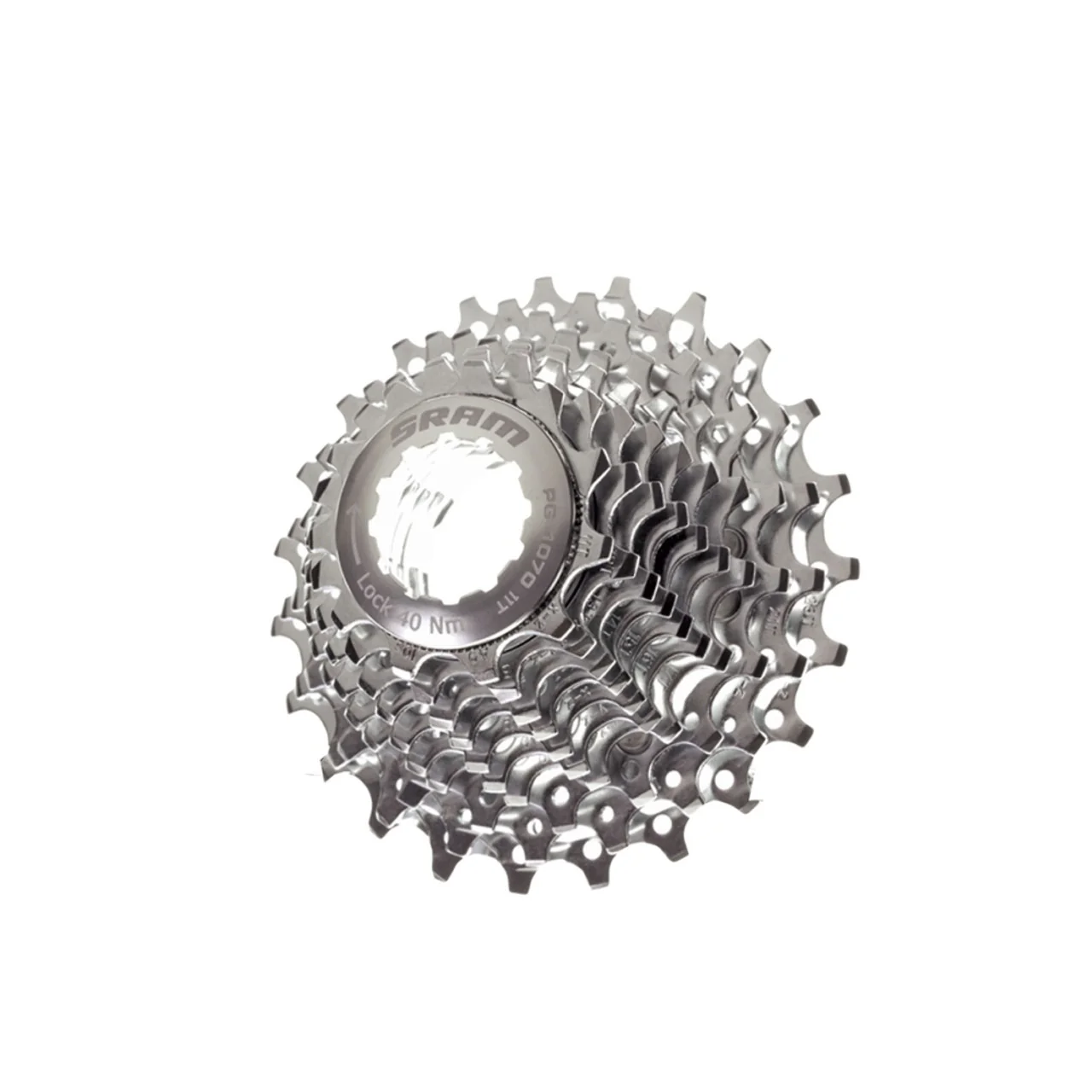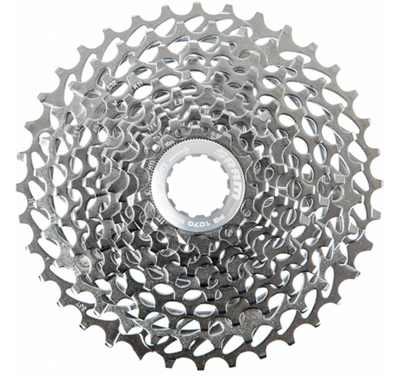 El diseño de media estrella del cassette Rival Power-Glide 1070 casete de SRAM mantiene un alto nivel de rendimiento en el cambio a la vez que crea una combinación casete/cadena más silenciosa.